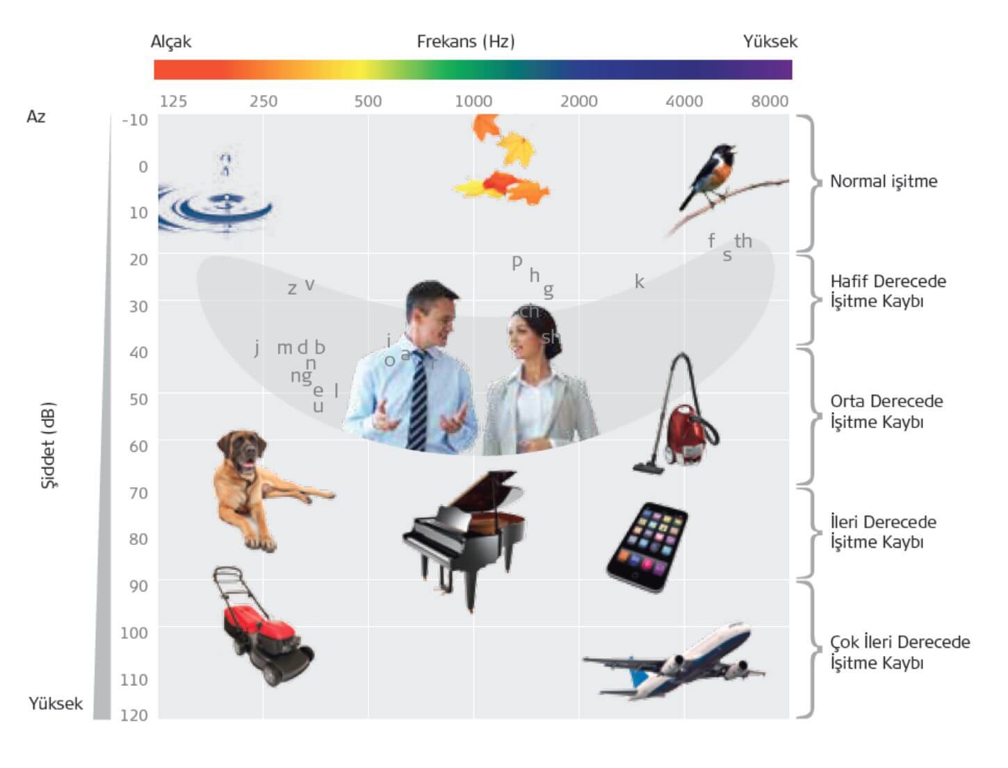 Sesin şiddeti ise desibel olarak ölçülür. 0 desibel (dB) “hiç ses yok” anlamına gelmez; ses sadece çok hafiftir. Normal konuşma sesi 55 dB civarındadır. 120 dB gibi aşırı yüksek bir ses ise, kalkmakta olan bir uçağın 25 metre uzağında durduğunuzda işitebileceğiniz bir sestir. Odyogramın yan kısmındaki sayılar ise, desibel olarak işitme düzeyini gösterir.